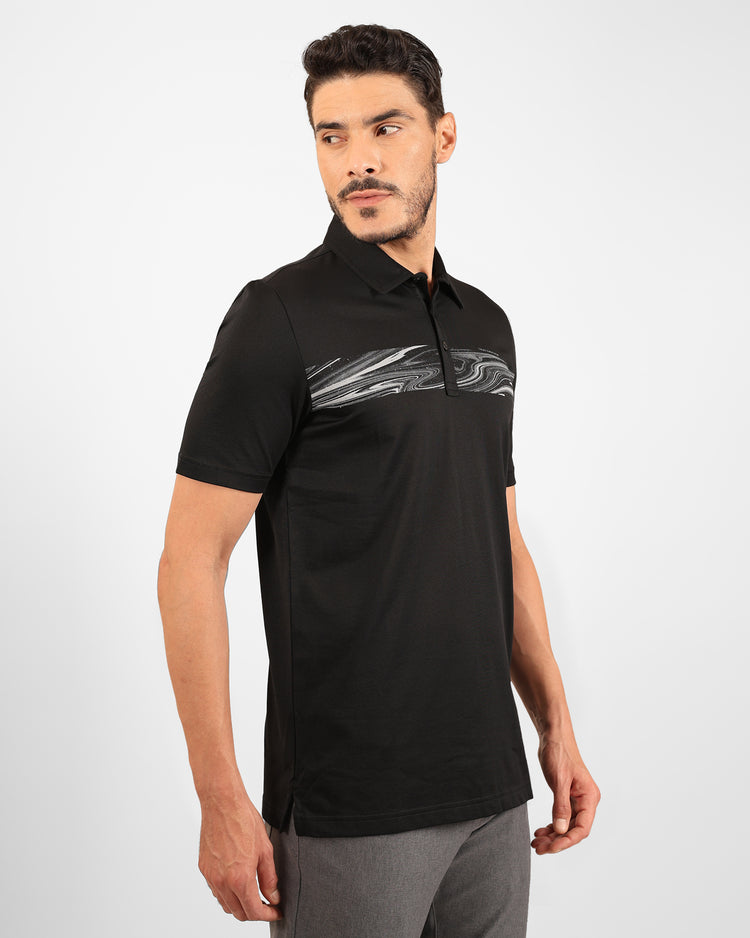 Sail fearlessly for DARK WATERS in a polo fit for any adventure. With a chest stripe featuring a marbled, abstract water motif, savor the journey, the destination, and every detour along the way.
